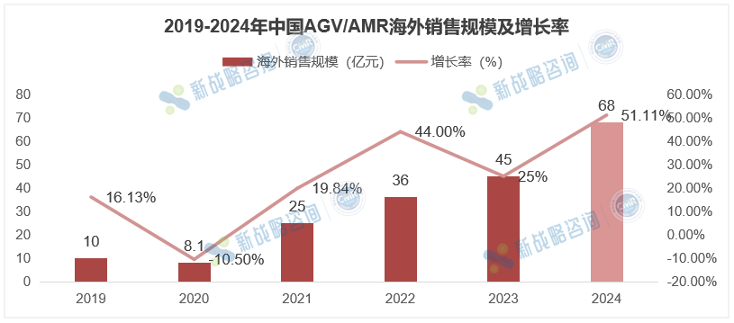 2024年,中國AGV/AMR企業(yè)海外銷售規(guī)模為68億,同比增長51.11%。在整體市場規(guī)模中占比為30.80%。國產(chǎn)AGV/AMR企業(yè)憑借高性價比解決方案和技術(shù)適配能力,在東南亞、歐美等市場實現(xiàn)規(guī)模化落地。