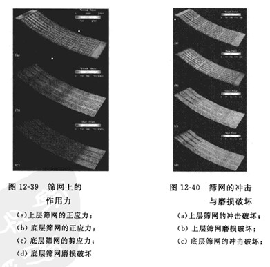 振動篩分機(jī)的DEM仿真結(jié)果可以用于分析顆粒群再篩網(wǎng)上的松散度、振動強(qiáng)度、料層厚度、篩孔孔徑和篩面傾角等參數(shù)對分離粒度及篩分效率的影響及相互作用。顆粒群再篩網(wǎng)上的流動平衡、顆粒對篩網(wǎng)的沖擊速度計施加在篩網(wǎng)上的載荷也能通過DEM仿真結(jié)果獲得,從而確定篩網(wǎng)所受的應(yīng)力、篩網(wǎng)的磨損及篩分裝置的功率、圖12-39和圖12-40分別為Yuan等人通過DEM仿真獲得的篩網(wǎng)上的作用力圖和篩網(wǎng)的沖擊與磨損破壞圖。
