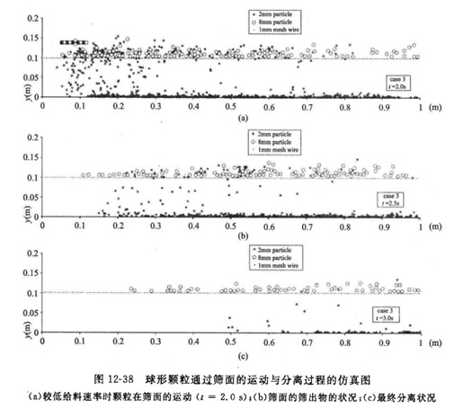 DEM仿真的過程信息能夠在線不同篩分工作條件下顆粒再篩面的運(yùn)動、顆粒同篩面之間的碰撞過程、顆粒通過篩網(wǎng)的分離過程,反映了不同力度顆粒在篩面上運(yùn)動形態(tài)的差異,再現(xiàn)不同篩分機(jī)工作條件下顆粒運(yùn)動過程,較為真實(shí)的描述顆粒同篩面之間的碰撞過程。圖12-38為Li等人模擬2mm和8mm球形顆粒通過篩面的運(yùn)動與分離過程圖。